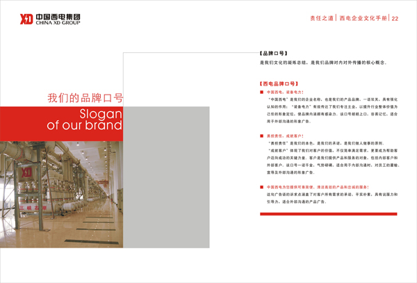 “中國(guó)西電”是我們的企業(yè)簡(jiǎn)稱,也是我們的產(chǎn)品品牌,一語(yǔ)雙關(guān),具有強(qiáng)化認(rèn)知的作用;“裝備電力”有效傳達(dá)了我們專注主業(yè),以提升行業(yè)整體價(jià)值為己任的形象定位,使品牌內(nèi)涵頗有感染力。該口號(hào)朗朗上口,容易記憶,適合用于外部溝通時(shí)的形象廣告。